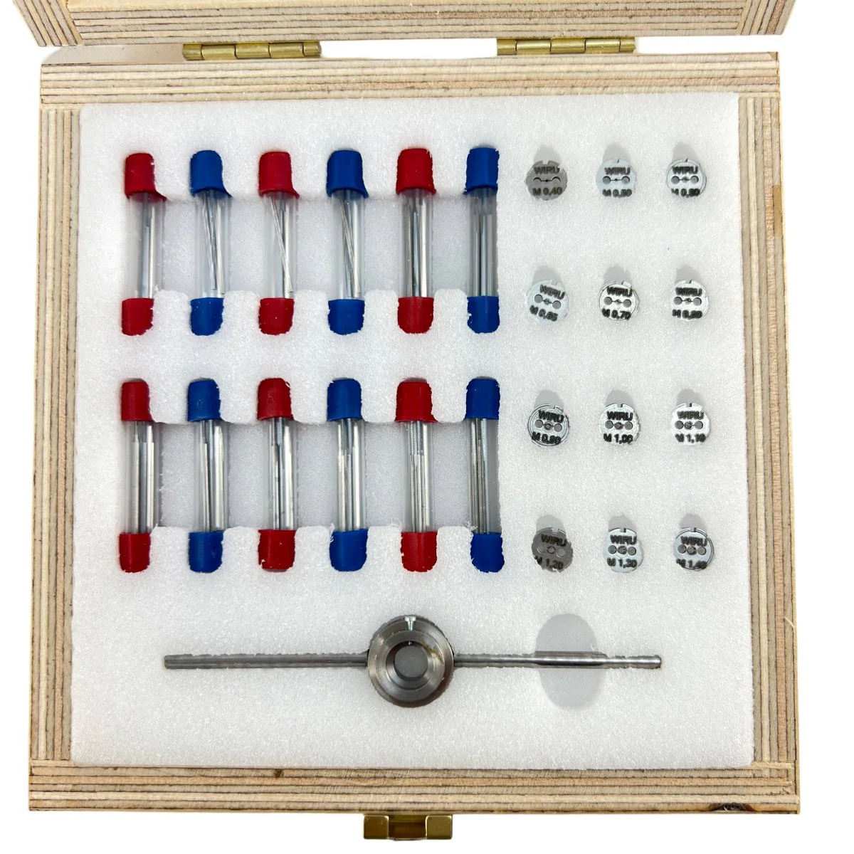 - 14 taps and 14 screw dies sized 0.4mm - 1.4mm in 0.1mm increments